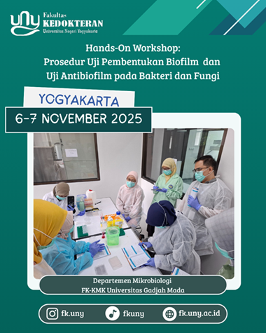 Yogyakarta – Tim Dosen dan Tendik Fakultas Kedokteran Universitas Negeri Yogyakarta, dr. Irena Agustiningtyas, M.Sc., Dhindha Normala Kusumastuti, S.Si., dan An Nisa Ega Artemisia, S.Si., M.Sc., mengikuti kegiatan Hands-On Workshop: Prosedur Uji Pembentukan Biofilm dan Uji Antibiofilm pada Bakteri dan Fungi pada tanggal 6–7 November 2025, yang diselenggarakan oleh Departemen Mikrobiologi FK-KMK Universitas Gadjah Mada.